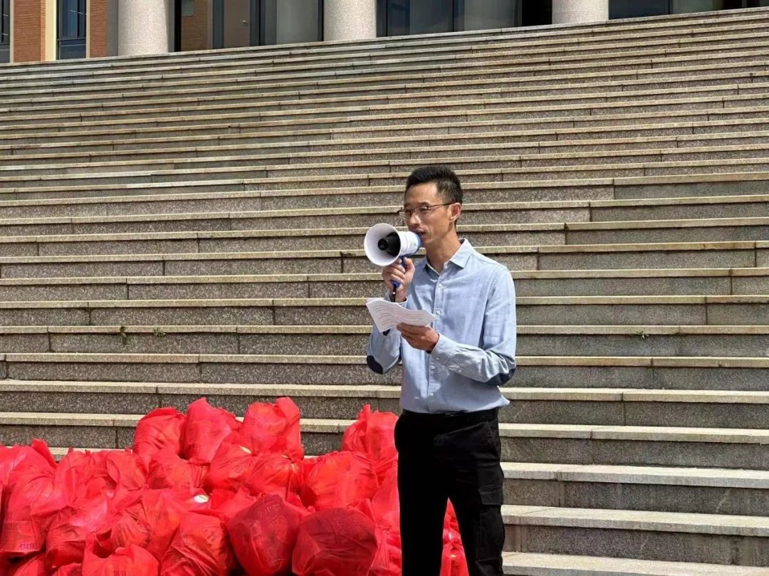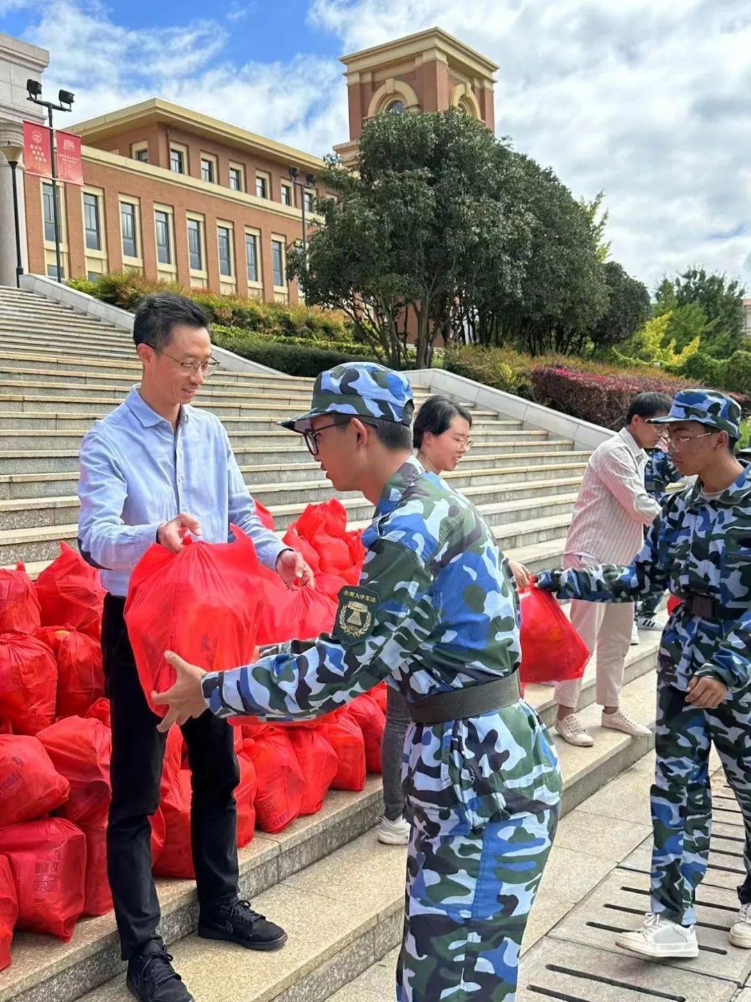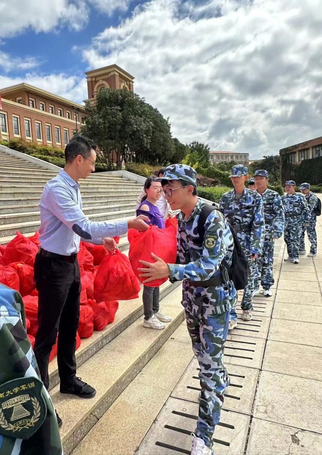 公司党委书记徐瑾老师致辞,强调了军训对同学们全面发展的重要性,希望大家能够珍惜这次宝贵的机会,积极参与训练,培养团队合作精神和自律能力。随后各位老师向员工们分发慰问品,同学们有序领取。